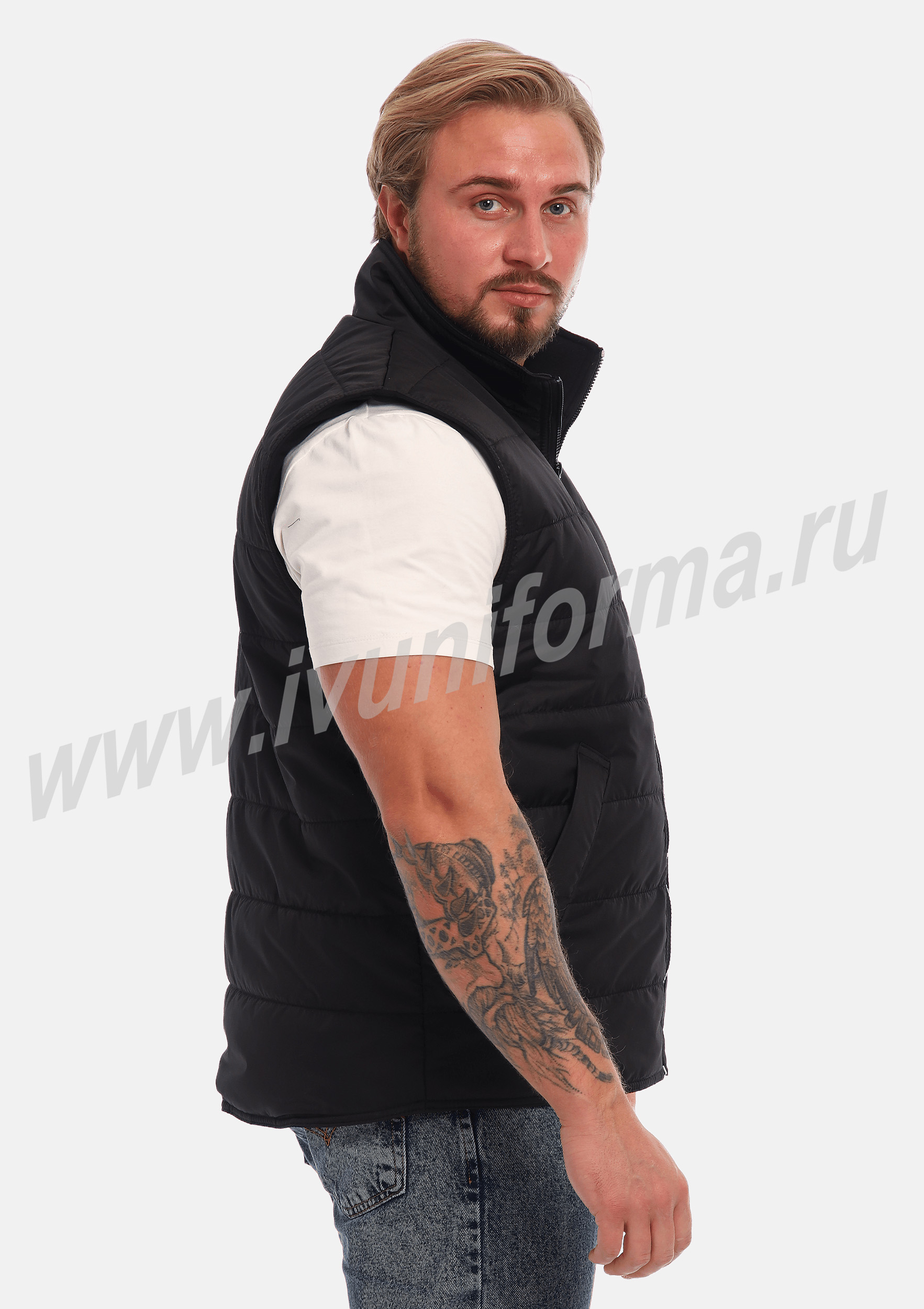 Жилет утепленный на молнии с двумя боковыми карманами в нижней части. Внутренняя часть жилета выполнена из ткани флис. В качестве утеплителя используется синтепон. Жилет является универсальным для использования как мужчинам, так и женщинам.